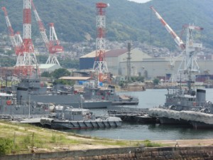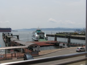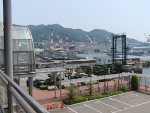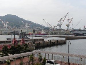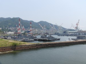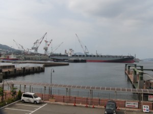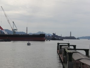 呉中央桟橋ターミナルから海や船を撮ってみました。大きな船とクレーンがたくさんです。