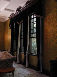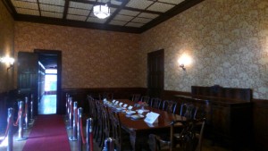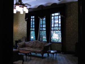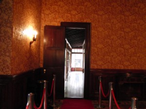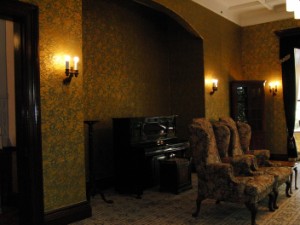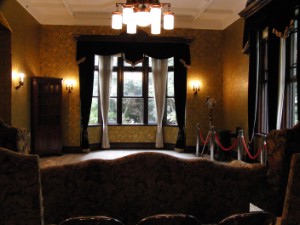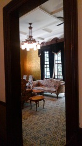 応接室のような部屋。細かい模様の壁紙やソファで豪華。